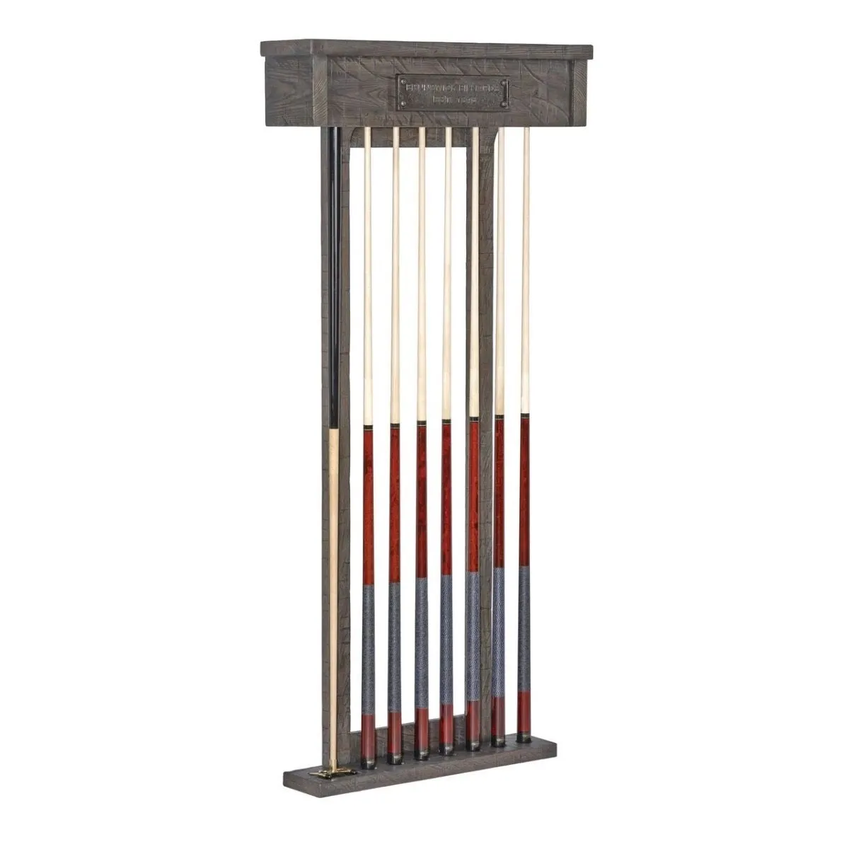 Enhance your pool room with the Birmingham Wall Cue Rack. This stylish rack complements the Birmingham pool table, featuring a rustic Charcoal finish and industrial design elements. A decorative iron plate with the Brunswick Billiards mark adds a touch of elegance. Designed for convenience and style. The Birmingham Wall Cue Rack holds up to eight cues or seven cues and a bridge stick, keeping your equipment organized and easily accessible. The durable Brunswick French mounting system ensures secure installation and long-lasting use.
