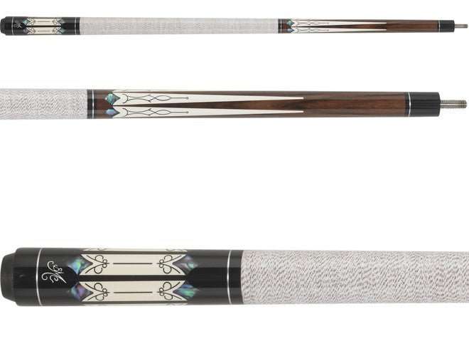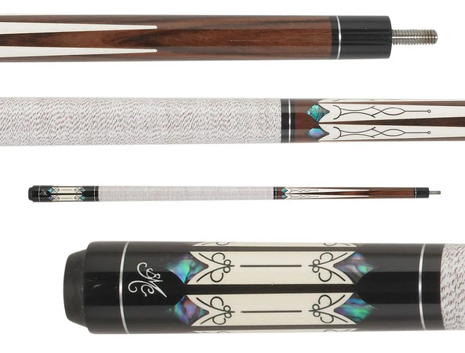 The Jayson Shaw JS-02 by Meucci is a beautiful cue that features a forearm made with Rosewood and cream downward points with black pinstripe designs and New Zealand Pāua shell diamonds. The sleeve is Black stained Rosewood with cream windows and uses black pinstripe designs and top and bottom New Zealand Pāua shell diamond. The handle is technically a no-wrap design using a Urethan coated White with tan Irish linen.