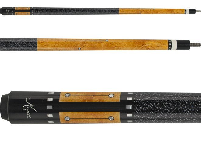 This Meucci model features a Honey-stained Maple forearm inlaid with thin black lines ending with round Pearl inlays. The wrap is Black with White Specks Lacquered Irish Linen. The sleeve really sets this cue apart showcasing Honey stained Maple boxes with Art Deco dashes. The MERB05K comes standard with a 12.75mm The Pro Shaft.